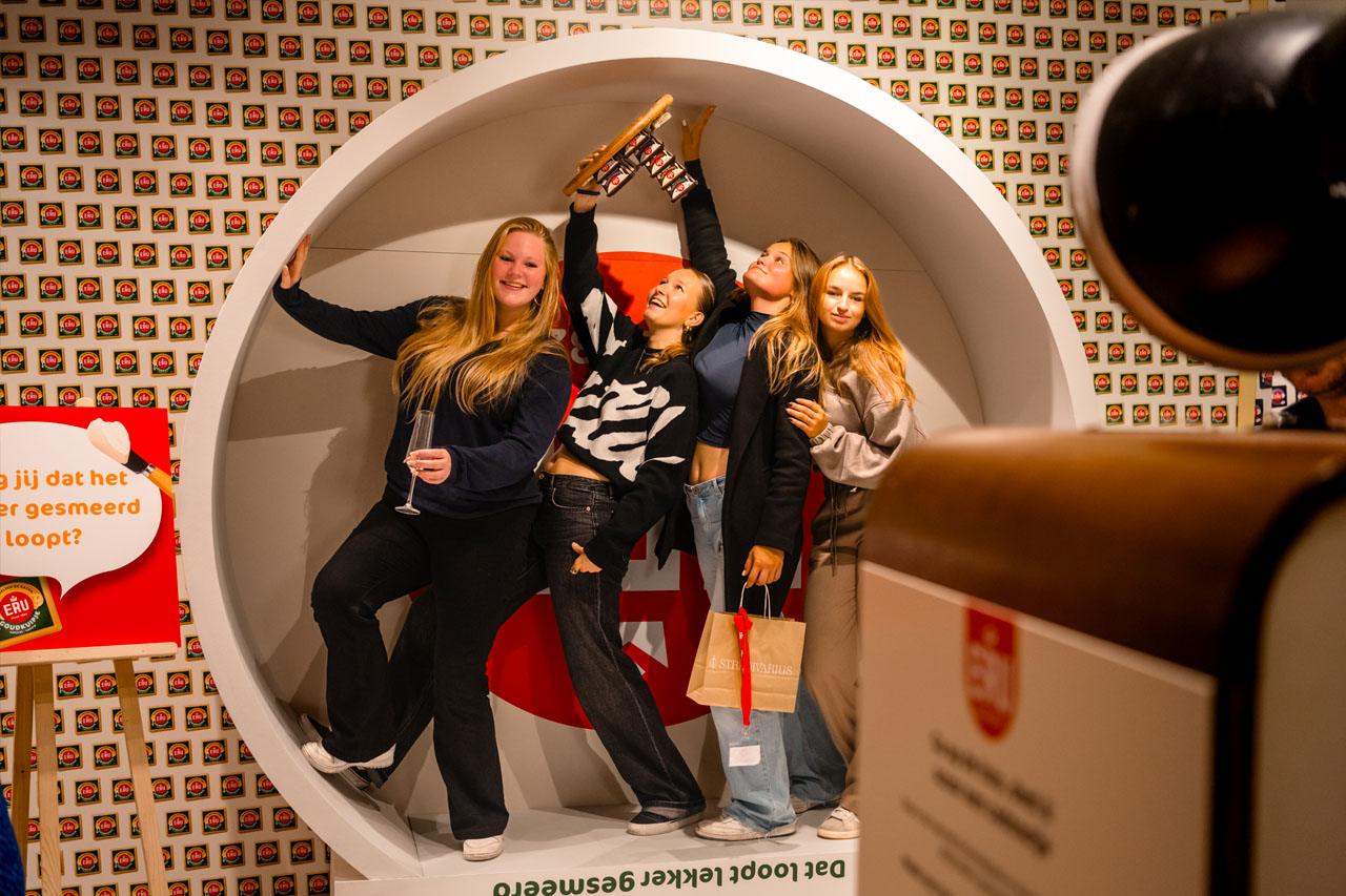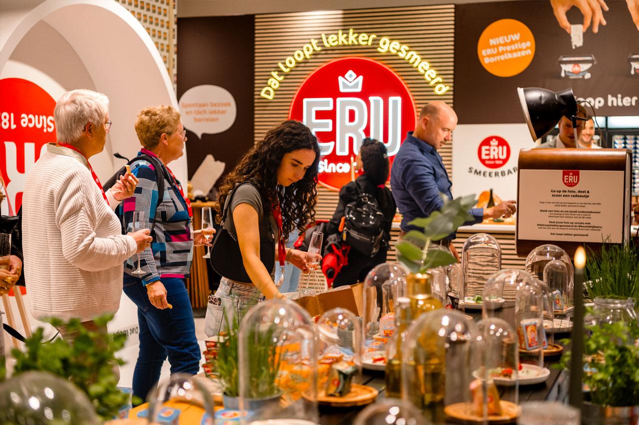 Het concept ‘Dat loopt lekker gesmeerd’ kwam tot leven via een interactieve food experience. Bezoekers proefden het volledige assortiment via een lopende band met ERU-gerechtjes, creëerden shareable content in de upside-down photobooth en konden hun favoriete smaken direct aan de bar kopen. Eén boodschap stond centraal: ERU is met gemak op elk broodje te smeren.