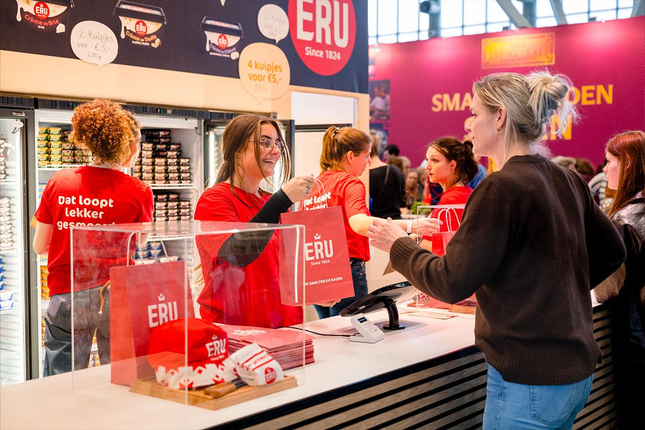 Na het succes van de ERU Smeerkaas pop-up store in Hoog Catharijne koos ERU opnieuw voor een krachtige live merkactivatie. Tijdens de Huishoudbeurs in de RAI Amsterdam, één van de grootste consumenten events van Nederland met ca. 120.000 bezoekers, realiseerden we een beursstand waar proeven, beleven en kopen centraal stond.